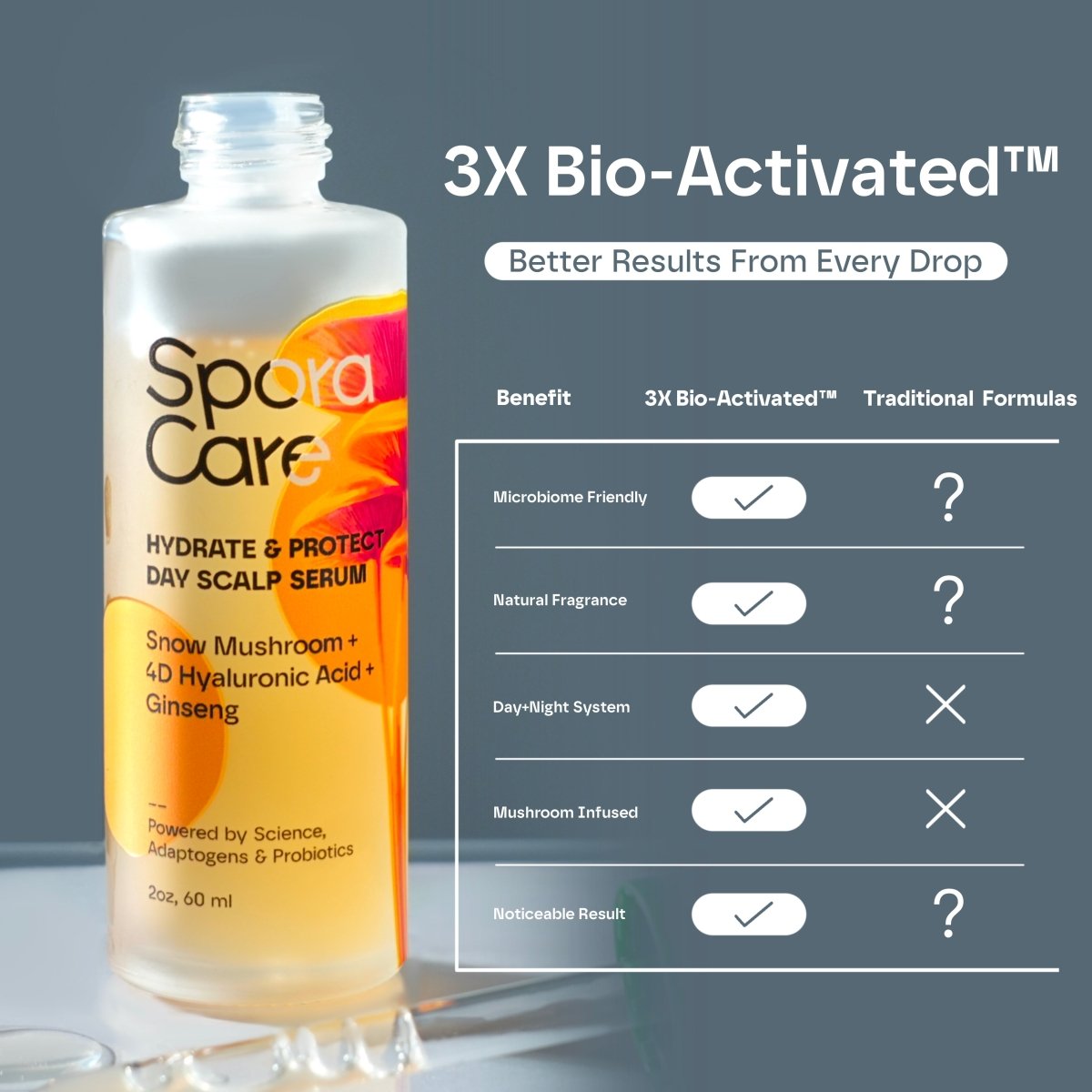 Functional mushrooms offer natural benefits that can help balance the scalp microbiome, soothe irritation, and support follicle health. The SporaCare 3X Bio-Activated™ formula synergistically combines functional mushrooms, probiotics, and high-performance actives to nourish the scalp's ecosystem and support circulation for stronger follicles.